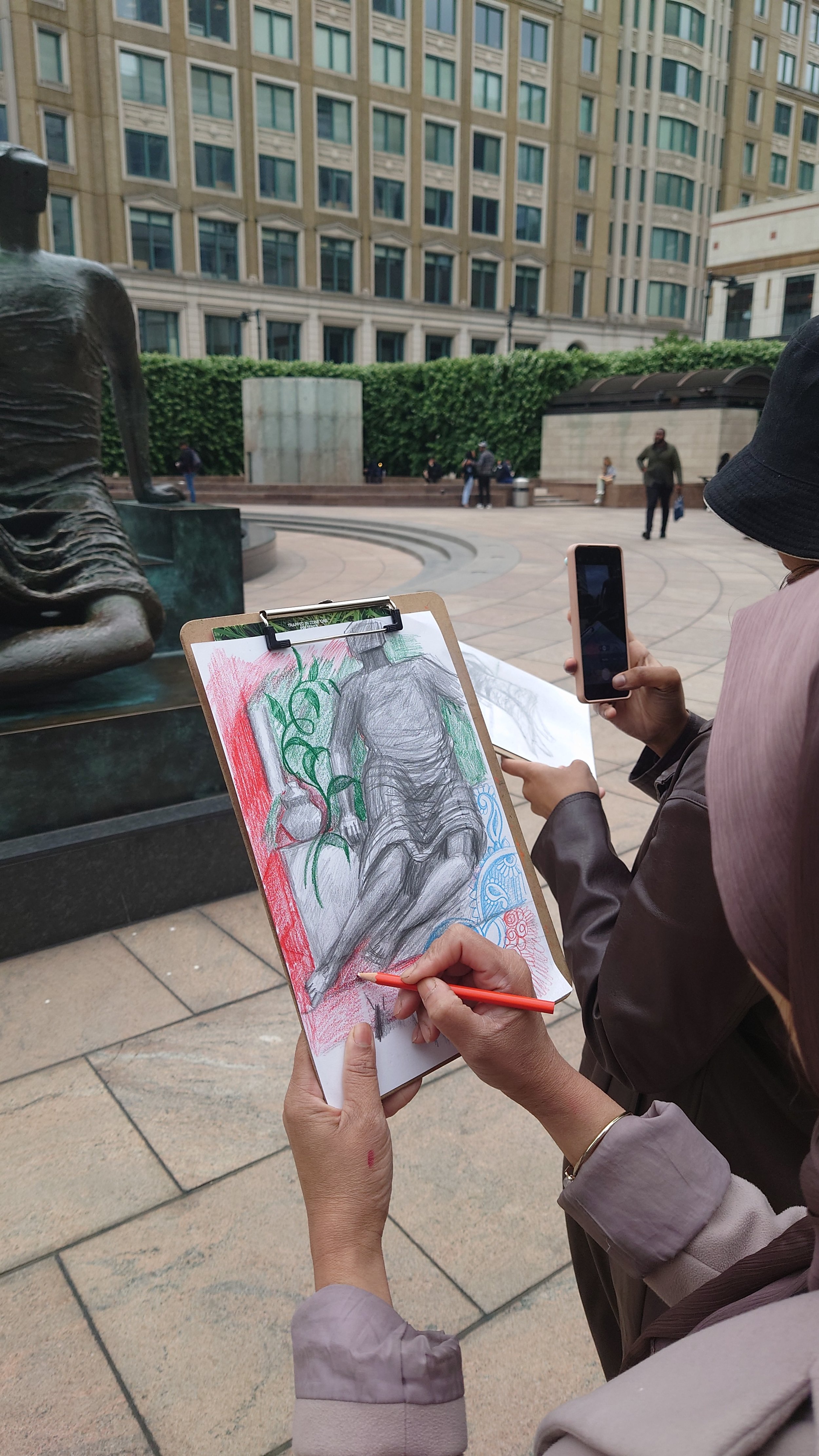 Move and Sketch was commissioned by Canary Whard Group to host a series of workshops incorporating movement and sketching in Canary Wharf, exploring Henry Moore's 'Draped Seated Woman' Old Flo sculpture.